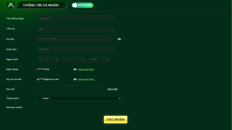Một số thông tin cá nhân quan trọng như tên đăng nhập không thể thay đổi sau khi đăng ký. Tuy nhiên, anh em có thể cập nhật các thông tin khác như địa chỉ, thành phố, hay đổi mật khẩu bằng cách truy cập vào mục “Tài Khoản” để thao tác.